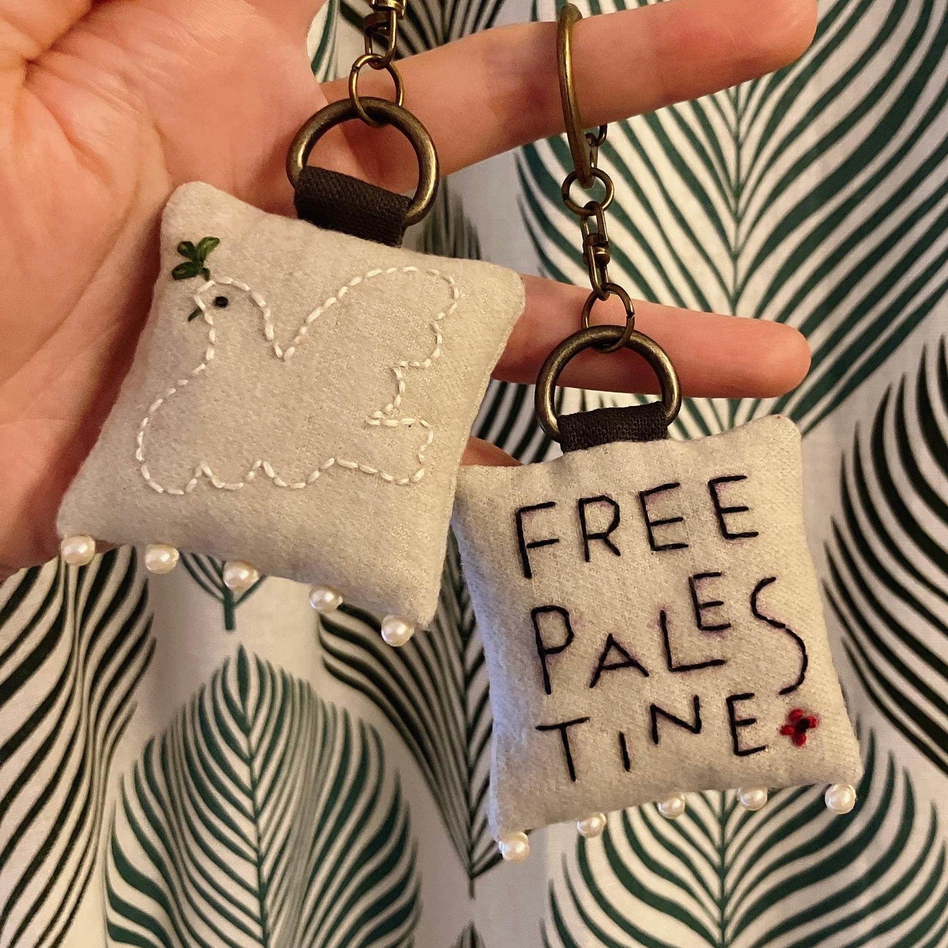 切り落とすところが出ないよう四角いクッションチャームにし、片面にはオリーブをくわえた鳩、もう片面には「FREE PALESTINE」の文字と小さな花を刺繍しました。